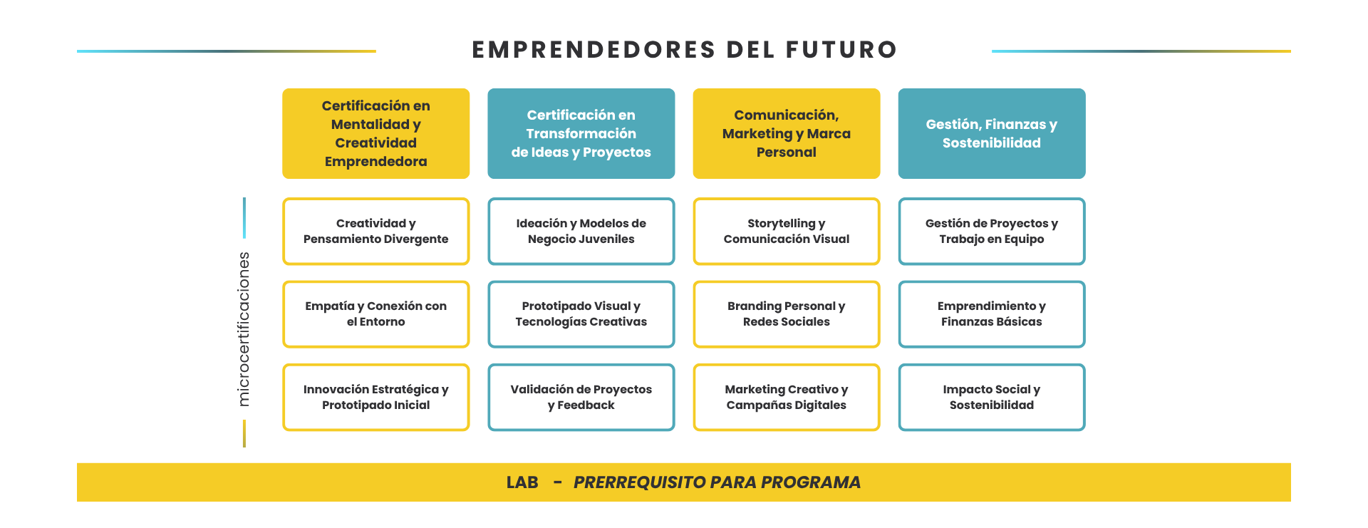 El futuro pertenece a quienes se atreven a imaginarlo y a transformarlo. El Programa Emprendedores del Futuro está diseñado para jóvenes que desean explorar su potencial creativo, aprender a innovar y emprender desde una edad temprana, cultivando habilidades que no solo les permitirán afrontar los desafíos del presente, sino también diseñar el futuro con propósito y acción. A lo largo de este programa, los participantes descubrirán que la creatividad no es un talento exclusivo, sino una habilidad que se puede cultivar, y que emprender no es solo crear negocios, sino también encontrar soluciones innovadoras a problemas reales.