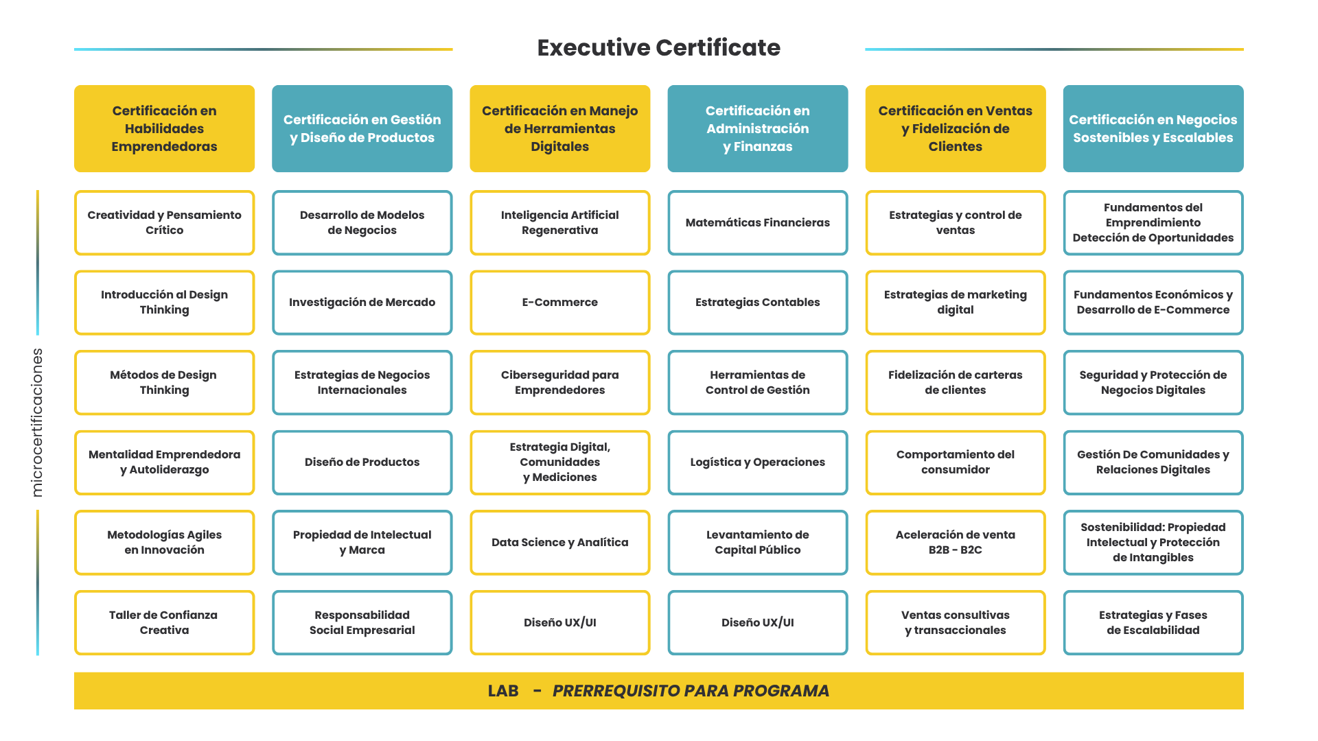 El Programa de las 6 Certificaciones está diseñado para transformar a los participantes en líderes innovadores, con competencias avanzadas en creatividad, gestión empresarial y emprendimiento, preparándolos para enfrentar los desafíos del entorno actual y aprovechar las oportunidades emergentes.