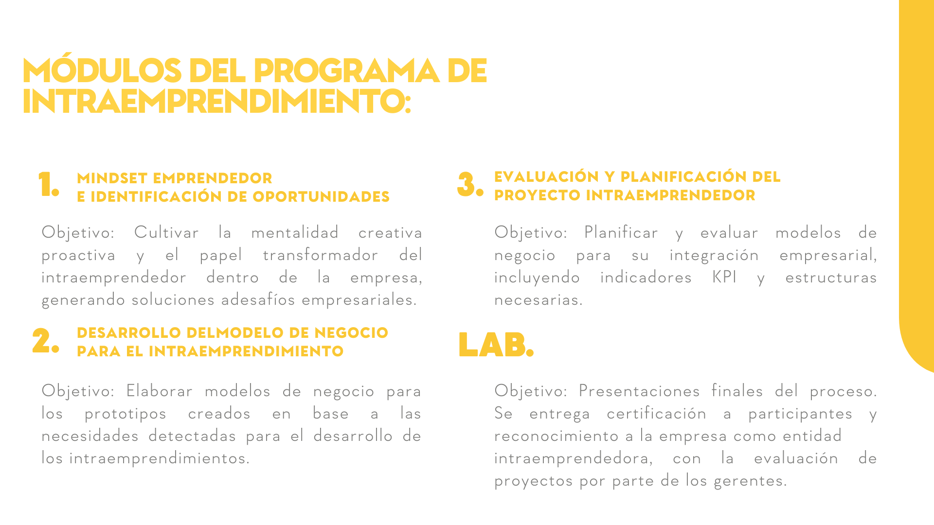 Resumen Programa práctico y estratégico (80 horas, 3 módulos + laboratorio) para formar intraemprendedores capaces de detectar oportunidades, diseñar soluciones viables y escalar proyectos dentro de la empresa. Un enfoque diseñado para impulsar la innovación, mejorar la eficiencia operativa y abrir nuevas líneas de negocio con respaldo corporativo.